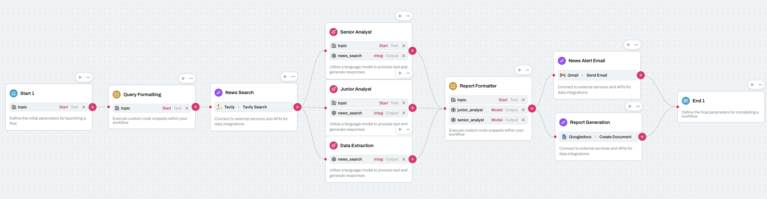 The Market Research workflow makes it quick and easy to conduct research on a topic and generate a report with the findings. The workflow takes in a user question, researches the topic, creates both a brief and detailed summary, performs data extraction, generates a report and uploads the report to Google Docs and sends an email.